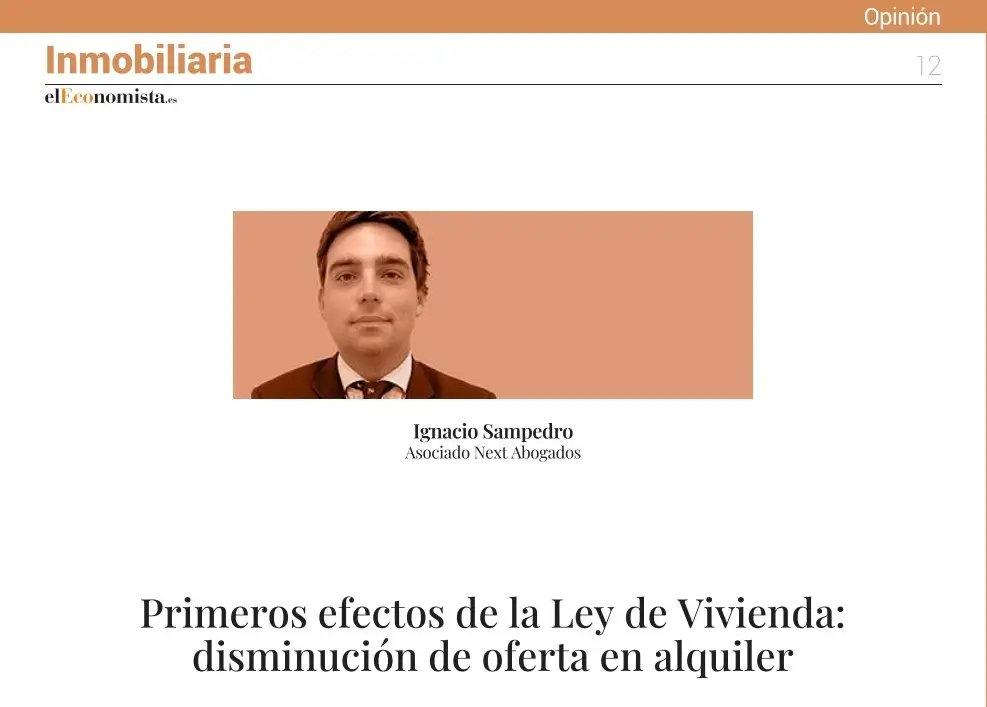Han pasado cinco meses de la entrada en vigor de la Ley 12/2023 por el derecho a la vivienda, y el panorama inmobiliario presenta transformaciones significativas. Más allá de las previsiones, los efectos se extienden a arrendadores, inquilinos, constructores y agencias inmobiliarias. Han pasado cinco meses de la entrada en vigor de la Ley 12/2023 por el derecho a la vivienda, y el panorama inmobiliario presenta transformaciones significativas. Más allá de las previsiones, los efectos se extienden a arrendadores, inquilinos, constructores y agencias inmobiliarias. Nuestro Asociado, Ignacio Sampedro, aborda este asunto para la revista inmobiliaria de El Economista. Una vez transcurridos cinco meses desde la entrada en vigor de la Ley 12/2023, de 24 de mayo, por el derecho a la vivienda (Ley de Vivienda), se observan algunos efectos en el sector inmobiliario derivados de su implantación. Los expertos coincidían que la entrada en vigor de la Ley de Vivienda iba a tener implicaciones negativas para los arrendadores, pero también se han extendido éstas a inquilinos, constructores y agencias inmobiliarias. Algunos de estos efectos eran previsibles, como el aumento de la inseguridad jurídica al ralentizar los procedimientos de desocupación de okupas, las desigualdades sociales y económicas entre las comunidades autónomas que quieran aplicar o no la Ley de Vivienda o el impacto negativo que ha tenido para los promotores inmobiliarios, al tener que aumentar sus cesiones de edificabilidad para viviendas protegidas. Sin embargo, una de las consecuencias que más interés está suscitando es la preocupante caída de más de un 30 % en la oferta de pisos de alquiler, cuestión que pasamos a analizar a continuación. ¿Cuáles son las razones de esta disminución en la oferta? Una de las principales razones que motiva este desplome es la limitación en la actualización y elevación de la renta del alquiler impuesto por la Ley de Vivienda. La limitación de la capacidad del propietario de incrementar libremente el precio a pagar por el inquilino en concepto de renta, entre un contrato de arrendamiento y el siguiente a celebrar, si la vivienda se encuentra en una zona de mercado tensionado (zonas en las que exista un especial riesgo de oferta insuficiente de vivienda para la población en condiciones que la hagan asequible para su acceso en el mercado) es una de las principales causas de este descenso en la oferta de alquileres. En estos casos, de conformidad con el artículo 17.6 de la Ley 29/1994, de 24 de noviembre, de Arrendamientos Urbanos (LAU), la renta pactada al inicio del nuevo contrato solo podrá actualizarse, respecto de la fijada en el anterior contrato, con la cláusula de actualización anual de la renta que se recoja en el contrato previo, y, adicionalmente, podrá incrementarse hasta otro 10% en el caso de haberse realizado rehabilitaciones o mejoras en el inmueble entre ambos contratos. Además, si el arrendador tiene la condición de gran tenedor (persona física o jurídica que sea titular de más de diez inmuebles urbanos de uso residencial o de una superficie construida de más de 1.500 metros cuadrados de uso residencial), dicha renta no podrá exceder, en ningún caso, el precio de referencia derivado del índice específico que se va a crear a tal fin. Otra causa primordial es el temor de los propietarios por el riesgo de impagos de los arrendatarios. El miedo a las ocupaciones y la posibilidad que se le reconoce al arrendatario para solicitar una prórroga excepcional de un año (o tres años si el inmueble está sito en una zona de mercado tensionado) a la finalización del contrato, o de sus prórrogas, si se encuentra en situación de vulnerabilidad económica (artículo 10.2 y 10.3 LAU), son impedimentos para que un dueño se decida a arrendar su vivienda. Por último, los propietarios están optando por la autogestión en el alquiler de vivienda para evitar el pago de los gastos de gestión inmobiliaria y de formalización del contrato de arrendamiento, que deberán ser sufragados por ellos imperativamente (artículo 20 LAU), lo que dificulta la labor de las agencias inmobiliarias y ralentiza la salida de viviendas en alquiler. ¿Qué consecuencias tendrá esta reducción de oferta? Este declive en la oferta llega acompañada de un aumento de la demanda, motivado por la dificultad en la adquisición de una vivienda, debido el encarecimiento de las hipotecas, tras la subida de los tipos de interés, y la pérdida del poder adquisitivo debido a la inflación experimentada durante estos últimos años. Todo esto, unido a la coyuntura económica actual, acentúa la desigualdad entre la oferta de pisos en alquiler y la demanda por parte de los arrendatarios, lo que implicará el encarecimiento del precio de los arrendamientos y la consecuente dificultad de muchas personas para acceder a un piso de alquiler. En la práctica, estas dificultades desincentivarán a los dueños a arrendar sus inmuebles bajo el régimen de la LAU, optando por enajenarlos, destinarlos al mercado del alquiler turístico o de temporada, o emplearlos en alternativas novedosas como el flex living, de escasa regulación legal en muchas regiones en España y mayores posibilidades de rentabilidad y beneficio para sus titulares. ¿Qué ocurrirá en el futuro más próximo? En un contexto tan volátil y dependiente de múltiples factores, no es sencillo realizar predicciones precisas sobre la evolución del mercado inmobiliario en el corto plazo, si bien todo parece indicar que, en 2024, nos encontraremos con un período de ralentización general. Es importante destacar que la oferta de vivienda de segunda mano ofrecerá mayores oportunidades en los próximos meses, dado que es un mercado mayor que el de la vivienda nueva. Sin embargo, los nuevos criterios de eficiencia energética harán más atractiva y ventajosa una vivienda sostenible frente a una de segunda mano. Estudios procedentes de las e